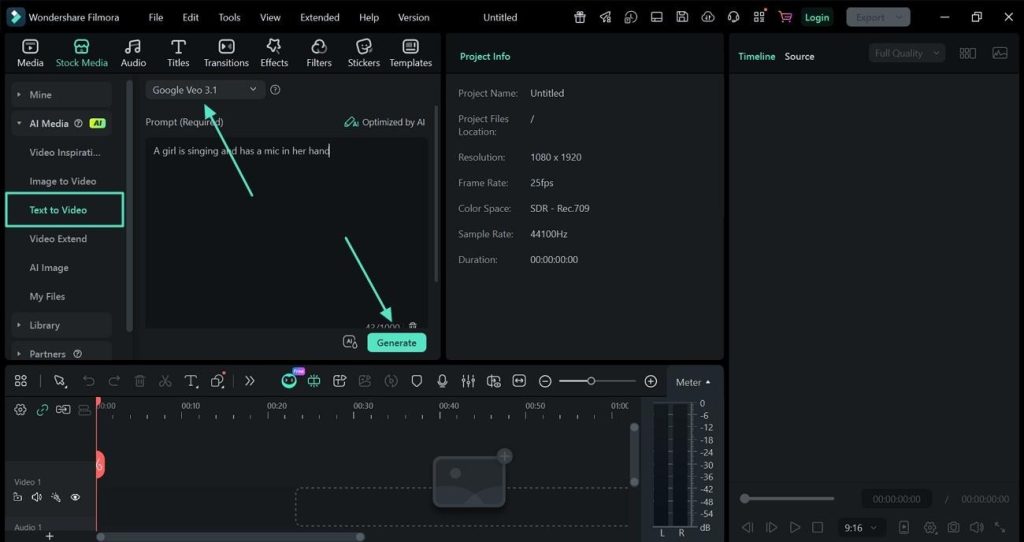 In the “Text to Video” feature, enter the prompt in the given “Text Box” and select the desired AI model like “Google Veo 3.1”. After that, hit the “Generate” button to start the generation process.