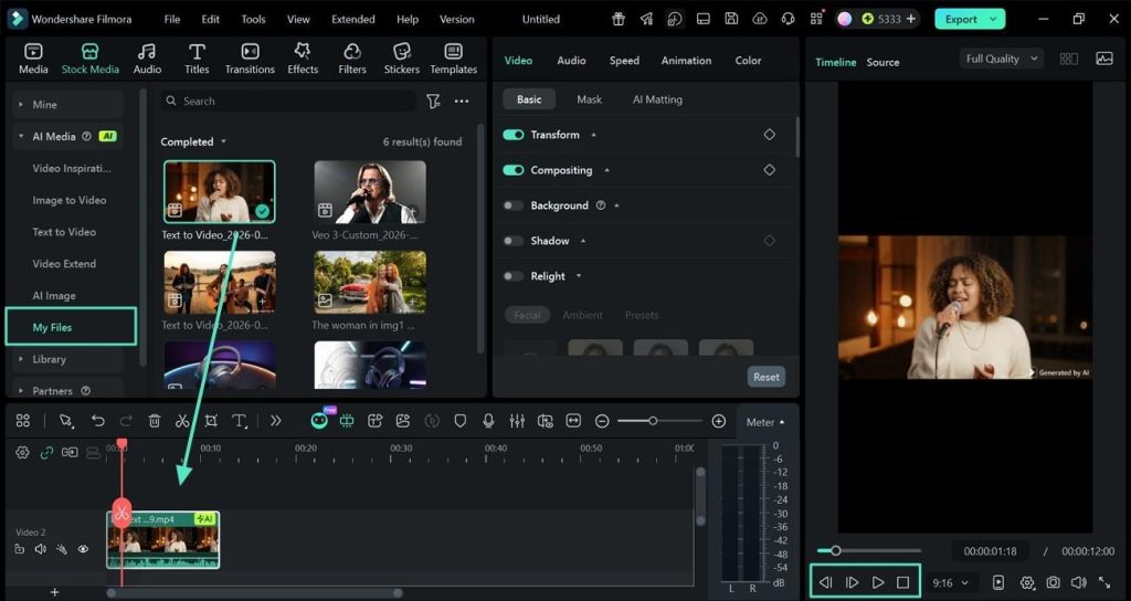 Now, go to the “My Files” section and drag-and-drop the video to the timeline, then preview it.